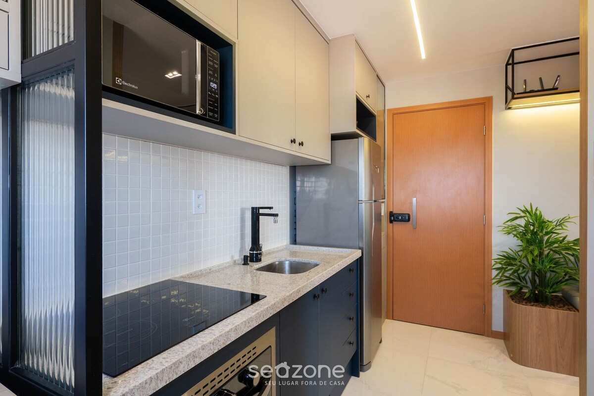 Modern and cosy studio 750 metres from Boca do Rio Beach and the Salvador Convention Centre. Located in a new, safe and well-developed residential complex, ideal for tourism or business trips. The space features a double bed, split-system air conditioning, Smart TV, Wi-Fi, and a fully equipped kitchen with a fridge, hob, microwave, coffee maker, sandwich maker and utensils. Includes bed linen, towels and one rotating parking space in the covered car park. Near the market, pharmacy, bakery and restaurants.