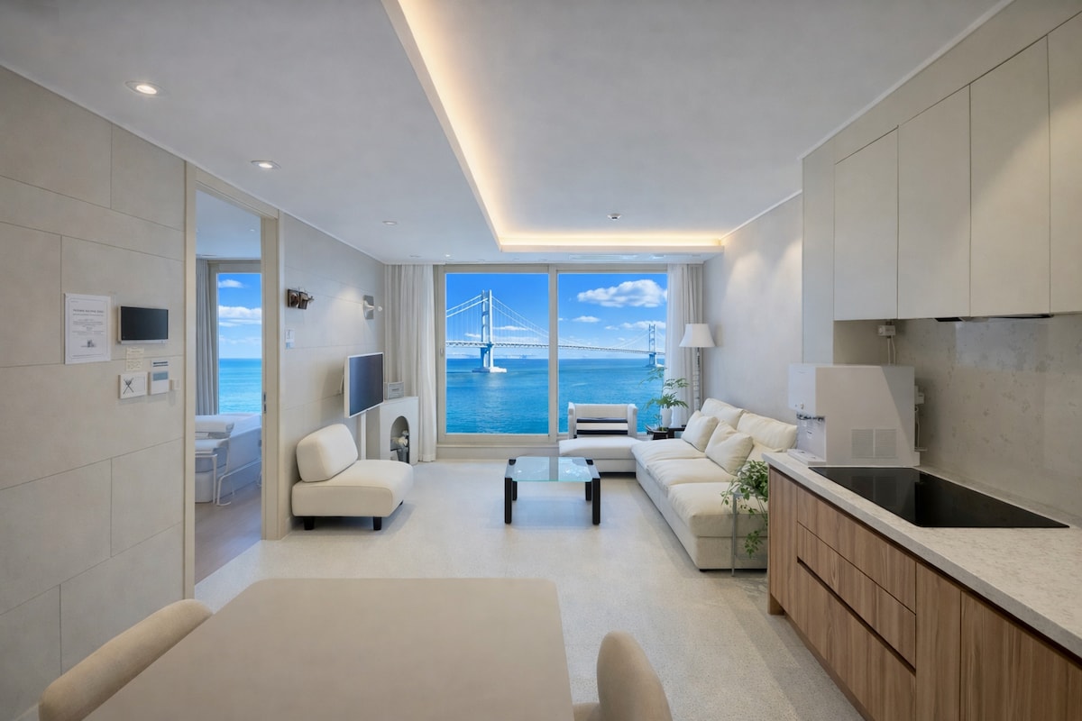 🩷 October 2025 Remodeling Grand Reopening 🩷 This is an ocean view with a front view of Gwangan Bridge. You can see the sunrise rising from Gwangan Bridge. Gwangalli Drone Show Performance 3 minutes walk to the beach 1 minute walk from Minrak the Market, 5 minutes walk from Waterfront Park 🩷 Check out slowly. (Check out at 13:00) Check in 16: 00/check out 13: 00 🩷 Standard 2 people (maximum 6 people) 🩷 This is a house that the host manages cleaning directly. 🩷 You can enjoy watching Korean broadcasting channel CableTV with a comfortable rest. 🩷 Free parking in the building (underground parking). 🩷 Please let us know in advance if you need luggage storage. 🩷 Cookable accommodation (induction) 🩷 Please do not make noise after 10pm. This accommodation is registered and operated as a legal company for domestic shared accommodation under the Mister Mansion Special Case.