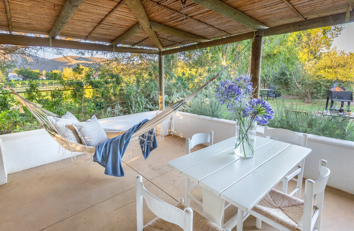 Hanepoot Cottage is close to Franschhoek village. You’ll love the cottage because of the spacious, private, setting on a working wine and fruit farm nestled against the mountains of Franschhoek Valley. Good for couples, solo adventurers, business travelers, and families (with kids). You are welcome to explore the farm and even practice your chipping and putting skills on the green.There is an inverter to provide electricity during loadshedding periods.
