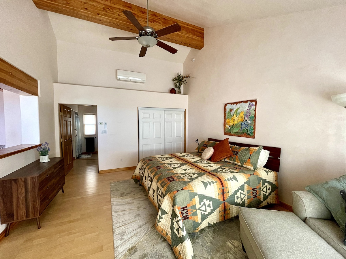 Our private-entry casita is nestled in the pines, boasts a canyon view, and is only a 5 minute drive to LANL, the Fuller Art Lodge, and the historic district. You’ll enjoy a luxurious queen bed, spa-like bath, and fully equipped kitchenette (stocked with treats!). Clerestory windows keep the space light and bright. Set back on the lot with a private patio and driveway. Easy access to Bandelier, Pajarito Ski Mountain, and downtown via shuttle or car. Let our casita be your home away from home!