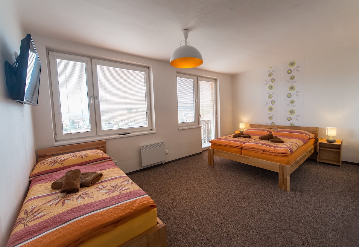 Apartment with 2 bedrooms and kitchenete with double bed and single bed in first bedroom, double bed in second bedroom, and kitchenete. Room has a beautiful view of the centre, with balcony, ensuite bathroom with shower and toilet,and kitchenete. Local tax is not included in accomodation fee - payable here in cash- 2 EUR p.p. / 1 night Parking place must be reserved in advance...limited number of parking spaces - cost 3 EUR / 1 night TV + SAT free WiFi connection Breakfast available - 9 EUR p.p.