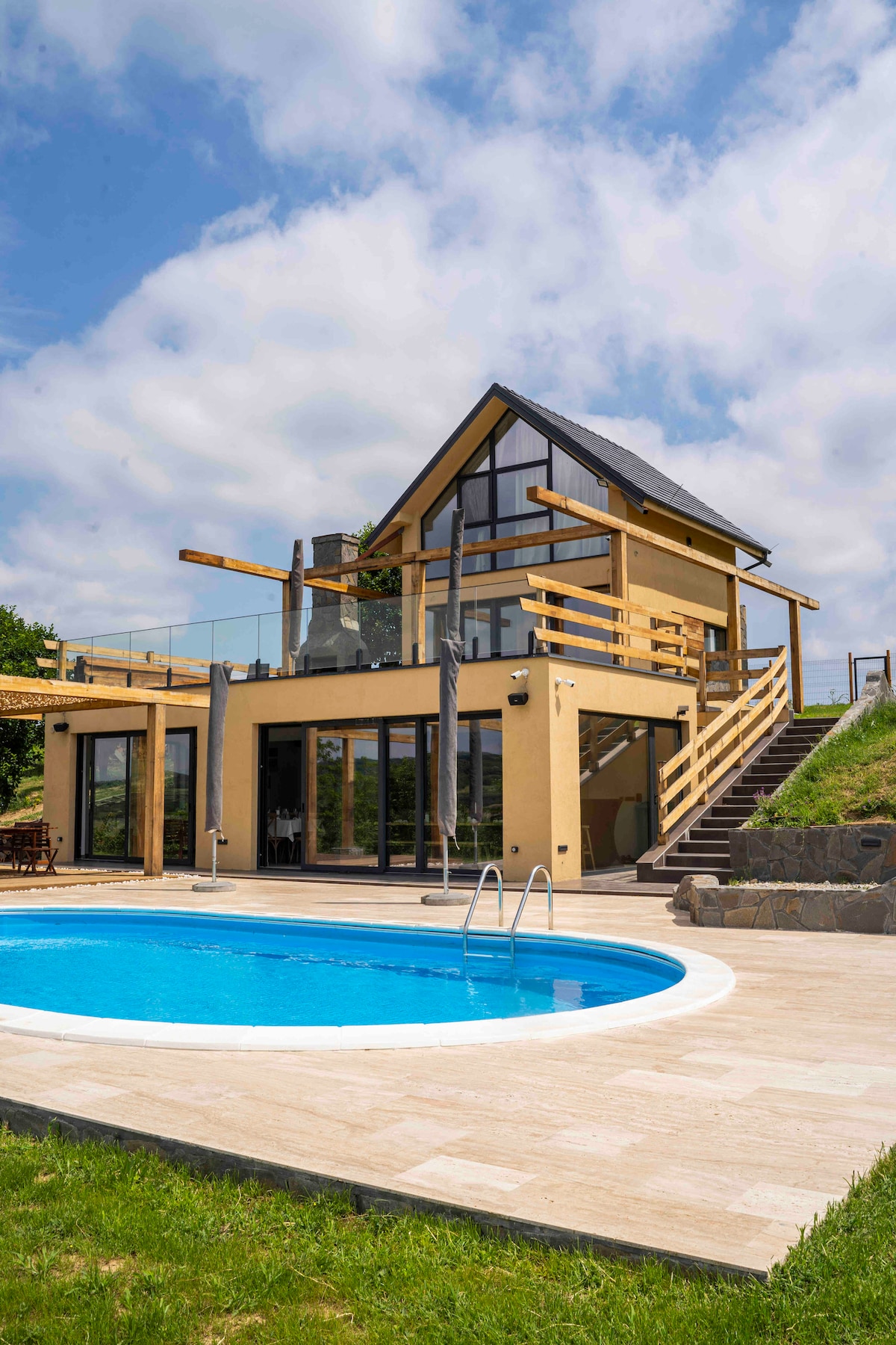 A modern wooden house surrounded by nature, featuring a private heated pool, jacuzzi and sauna. Spacious interior, fully equipped kitchen, comfortable bedrooms and large outdoor area make it perfect for relaxing