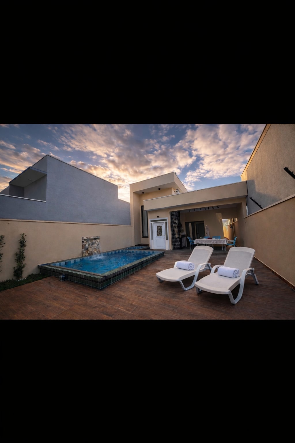 Country house in a gated community, with a barbecue area, swimming pool with whirlpool, pool table, vegetable garden, 3 bedrooms, toilet, large living room with open kitchen, 120mb fiber optic internet. Condominium with beautiful lakes, hiking trails and woods, lots of nature and total security. Ideal for relaxing with friends, great barbecue, new house and furniture.