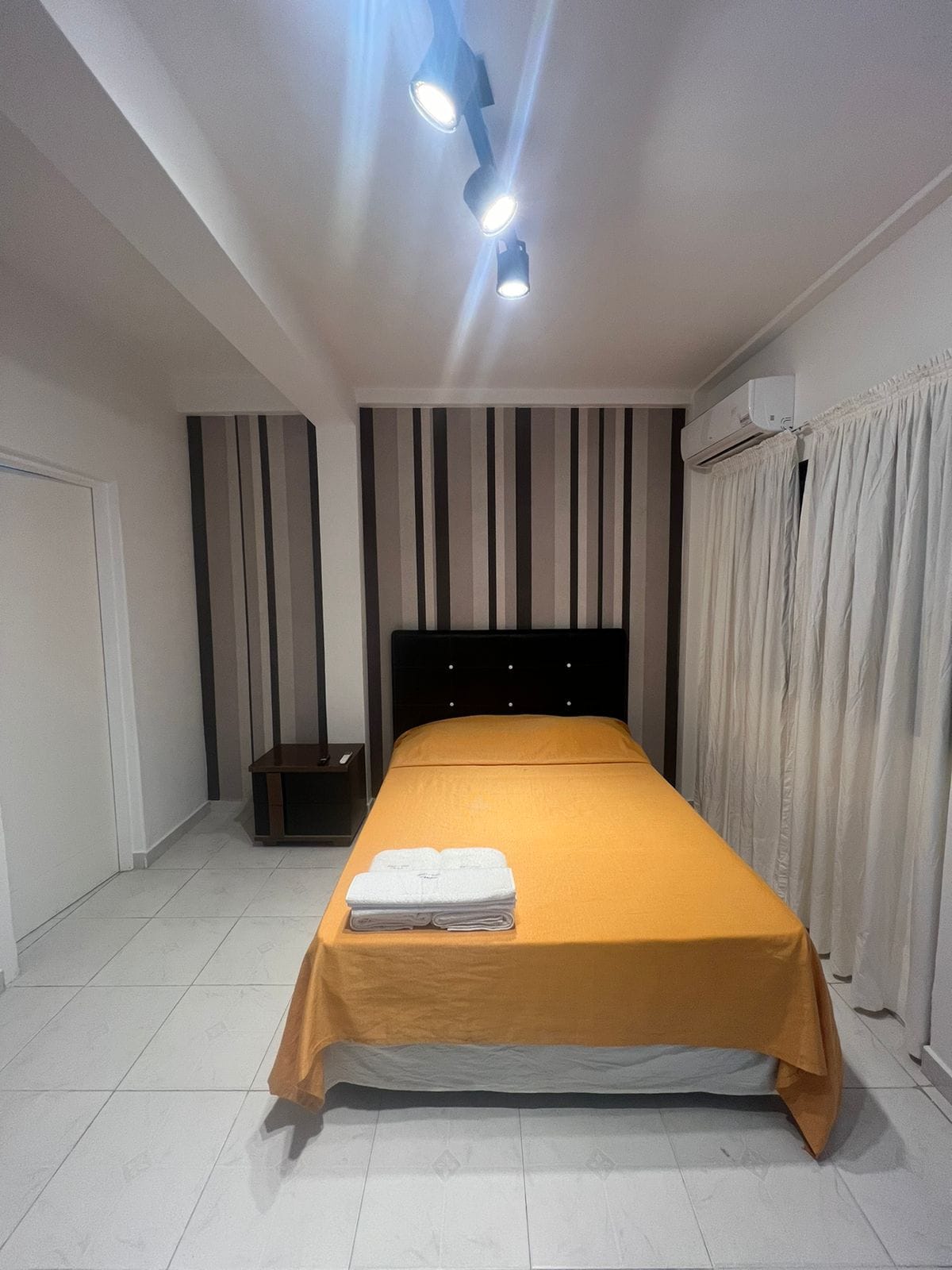 Enjoy the simplicity of this quiet and central place. Comfortable one room with a double bed, AC. Cold - heat, TV and placar. Dining room kitchen, with table, chairs, utensils for 2 people, kitchen, electric rack, microwave and refrigerator. The apartment consists of hot water in the kitchen and bath. Wi-Fi Service. Bedding (sheets) and bathroom (towels).