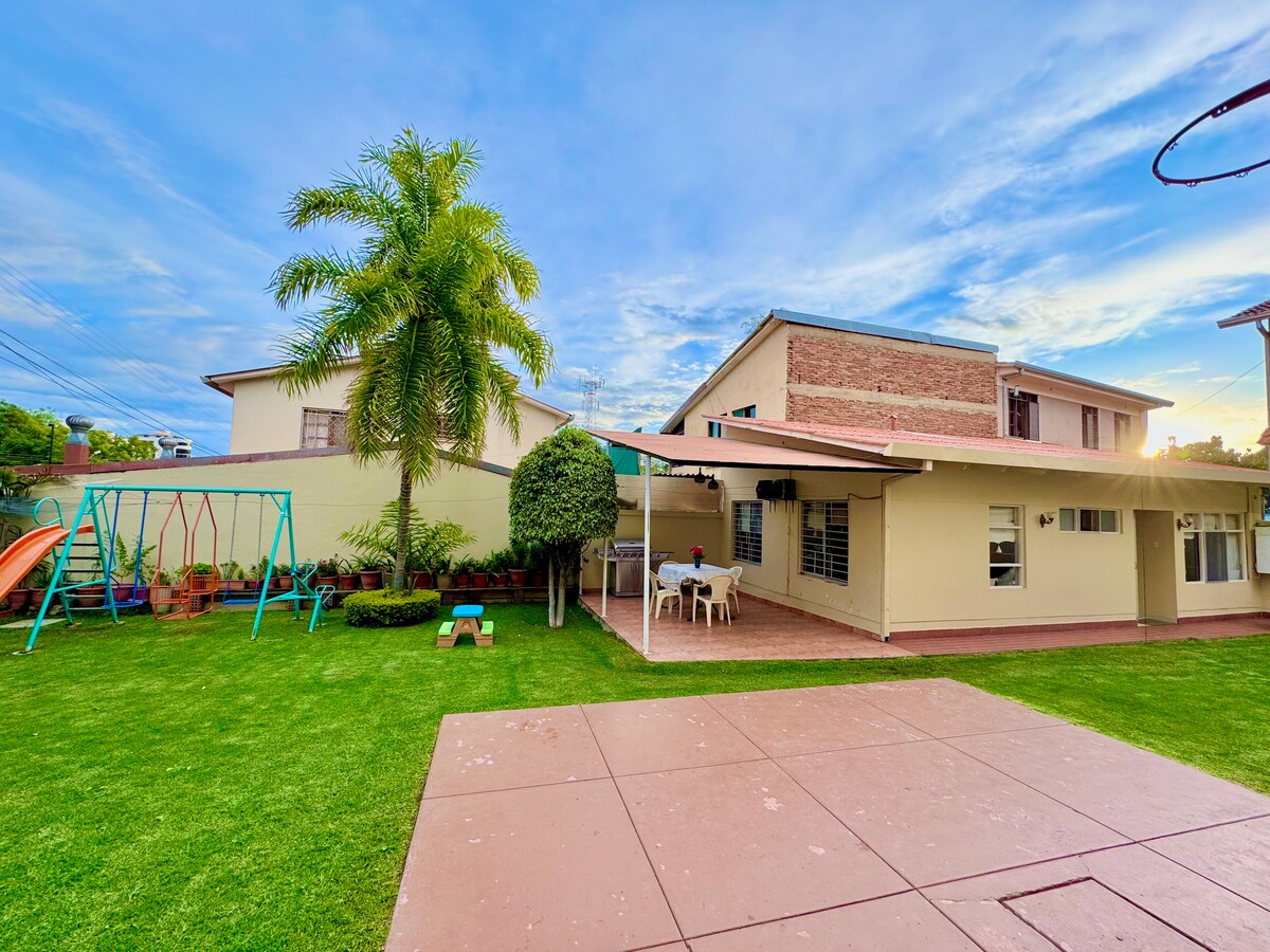 Beautiful guesthouse in the best zone in Cochabamba! Very cozy. Just minutes from all the best restaurants and parks. Market, supermarket and pharmacies are very close walking distance. Easy access to public transportation. Safe and calm upscale neighborhood with private security guard. Large patio with playground, basketball court and dining area for grilling. Two bedrooms with closets (crib upon request). Full bathroom and kitchen. Automatic washer available.