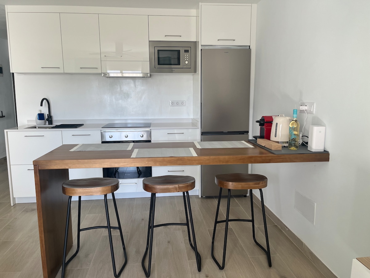 The apartment is bright and cosy, with a comfortable layout that includes a bedroom, living room, fully equipped kitchen and separate bathroom. It also has a 70-square-metre terrace on the top floor to share with the neighbours, ideal for enjoying the sun, dining al fresco, doing yoga or simply relaxing with panoramic sea views. The highlight is the sea views from both inside the apartment and from the balcony.