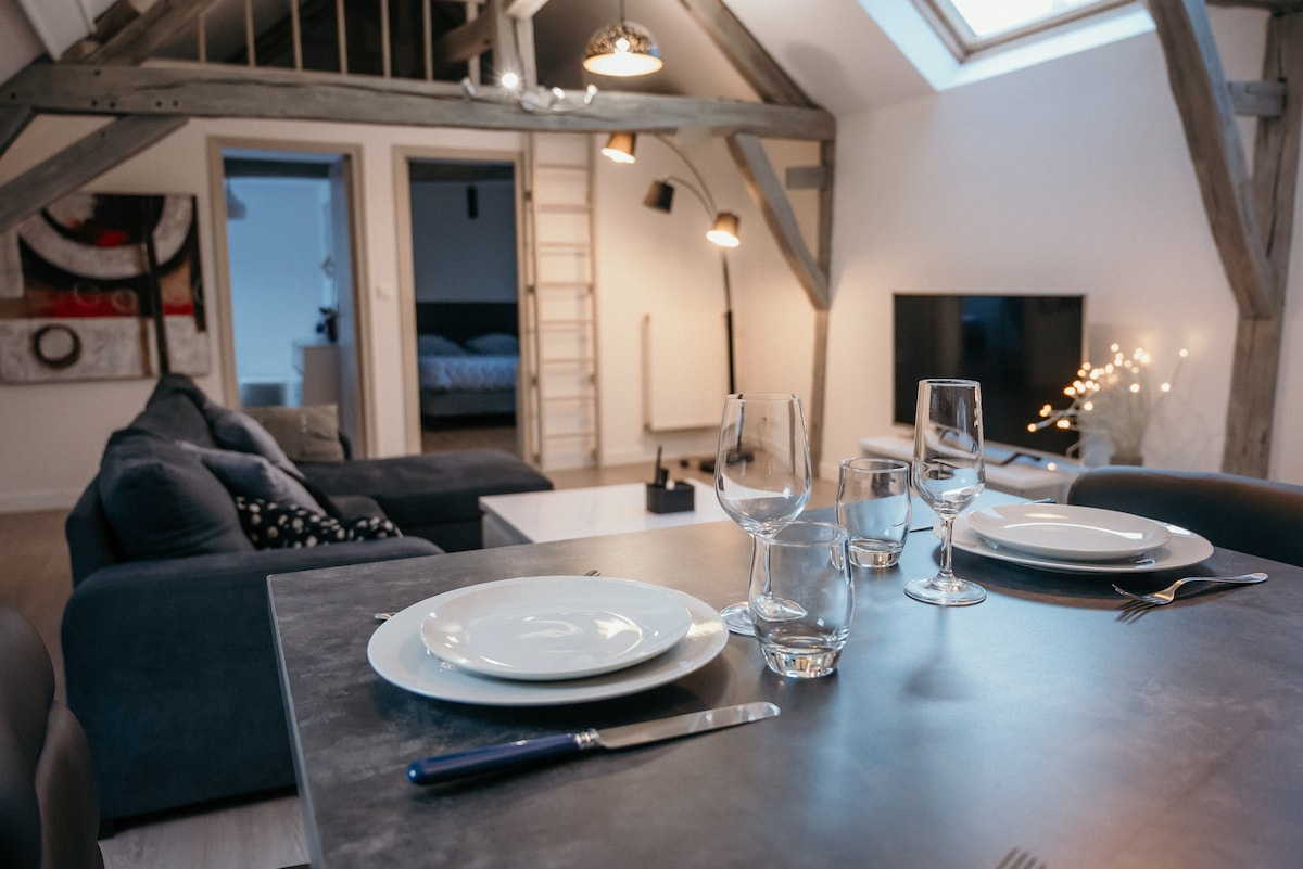 The "La Halte Ducale #2" studio is a beautiful studio in the heart of Charleville-Mézières, just 200 m and 3 minutes from Place Ducale! Located at the back of the courtyard, this peaceful retreat offers a unique experience combining authentic charm and modern comfort. Our accommodation, completely renovated, stands out for its authentic character and exceptional brightness. Every detail is carefully crafted to offer a pleasant and soothing living environment.