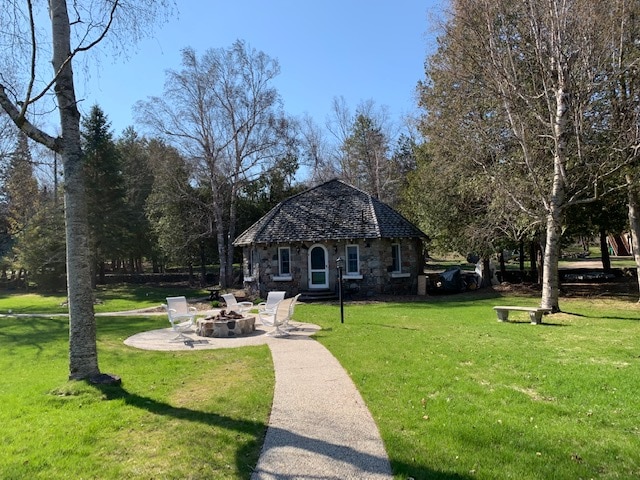 A grassy area framed by trees leads to a fire pit surrounded by seating logs, offering views of the shimmering blue-green waters of Grand Traverse Bay. The clear sky and tranquil scenery create a peaceful outdoor space ideal for gatherings.