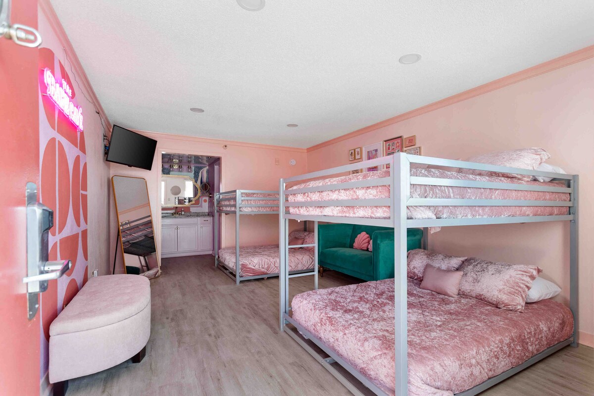 Enjoy the perfect beach vacation in this inland suite for up to six guests. Featuring two connected rooms—one with a king bed, the other with two queens—each with a private bathroom, TV, desk, microwave, mini fridge, Keurig, and two beach chairs. Take advantage of our hotel amenities, including two heated outdoor pools (open year-round!), a tiki bar, yoga on the weekends, bike rentals, and daily housekeeping—and no list of chores on the way out.
