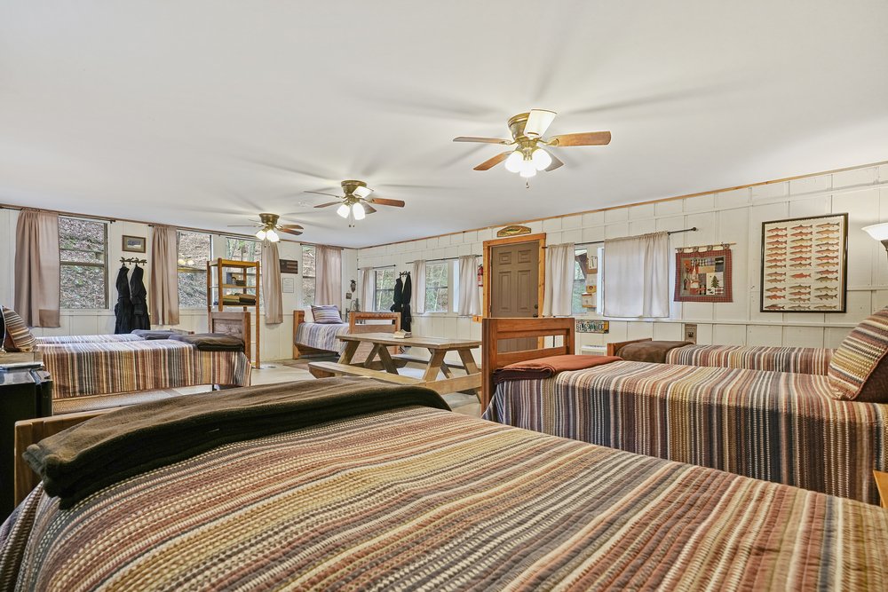 Located on 34 acres in the heart of Sumter National Forest, just 5 minutes from the Wild and Scenic Chattooga River, our rustic post and beam lodge, music loving tavern, 8 guest rooms and 17 creekside campsites will create memories that last a lifetime. Room 6 has one queen and is on the more social Courtyard Side. No private baths but the large marble bath house is steps away. All rooms have a rustic/lodge/mountain feel with vaulted ceilings, mini fridge, pod coffee maker and 40" tv.
