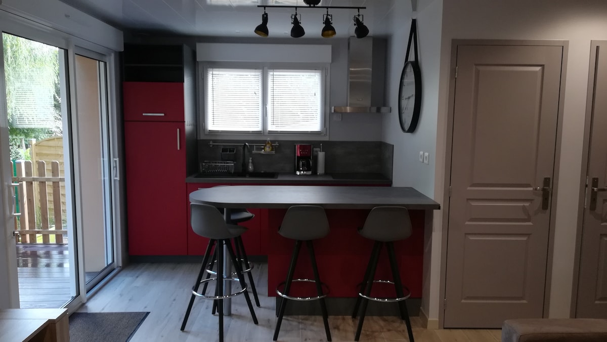 One-room, self-contained accommodation within a property Great for getting around, passing by. 10 min drive to the sea. Access to the city center on foot via the paths. 2kms from all shops and free shuttles in the summer to get to the seaside. Rentable by night, weekly, or monthly. Comfortable, quiet, insulated cabin, heating, freestanding fan, hot water, equipped kitchen, cooking equipment, cleaning essentials, etc..., towels and sheets provided