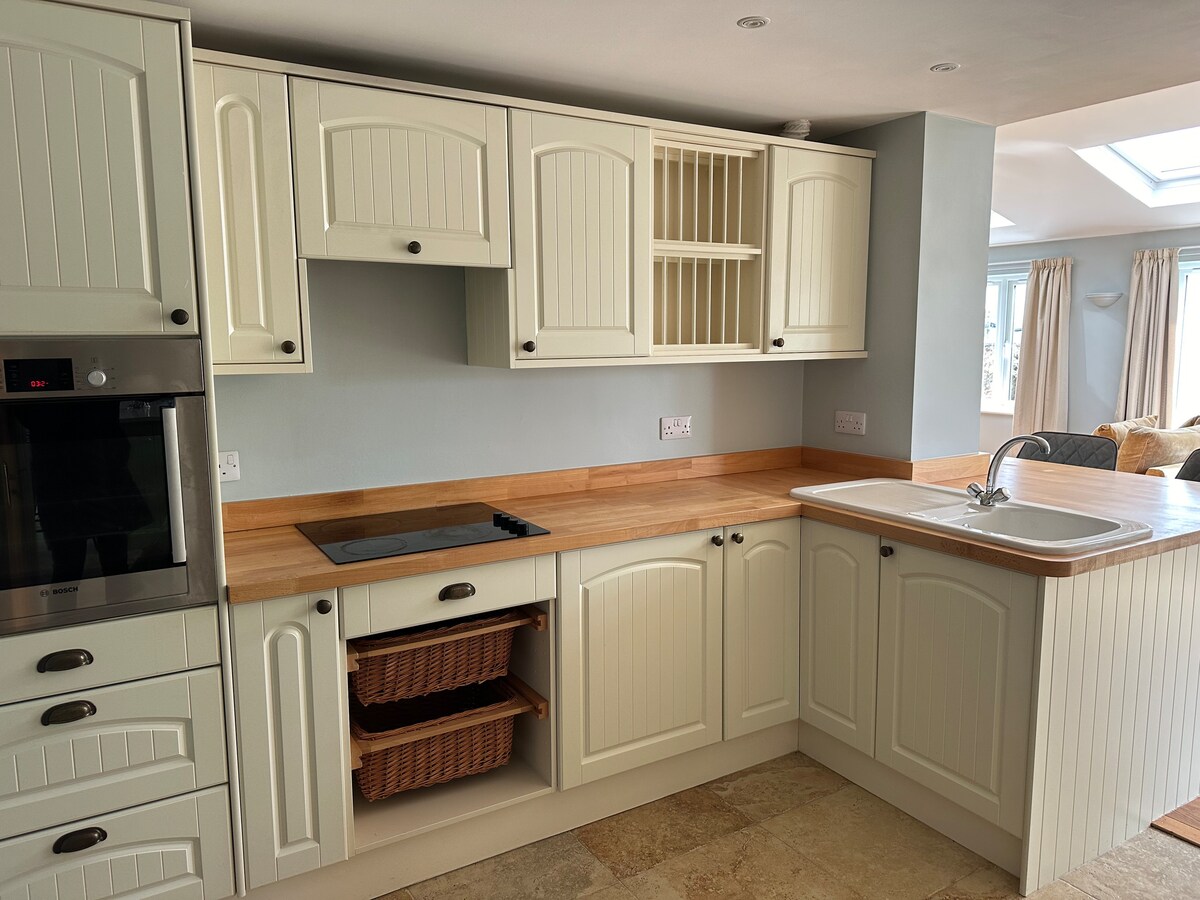 Sleeps two above oak framed garage, dogs welcome, private access, full fibre gigabit internet off road parking for one car with EV Charging point available. Double bed, reclining sofa, smart tv kitchenette with twin halogen hob, full sized oven, integrated fridge with icebox, microwave, kettle and toaster. Gateleg kitchen table sits 4 comfortably, separate shower and WC with shower fed from 120litre megastore at mains pressure. Ideal location and dog friendly (they must be able to climb stairs)