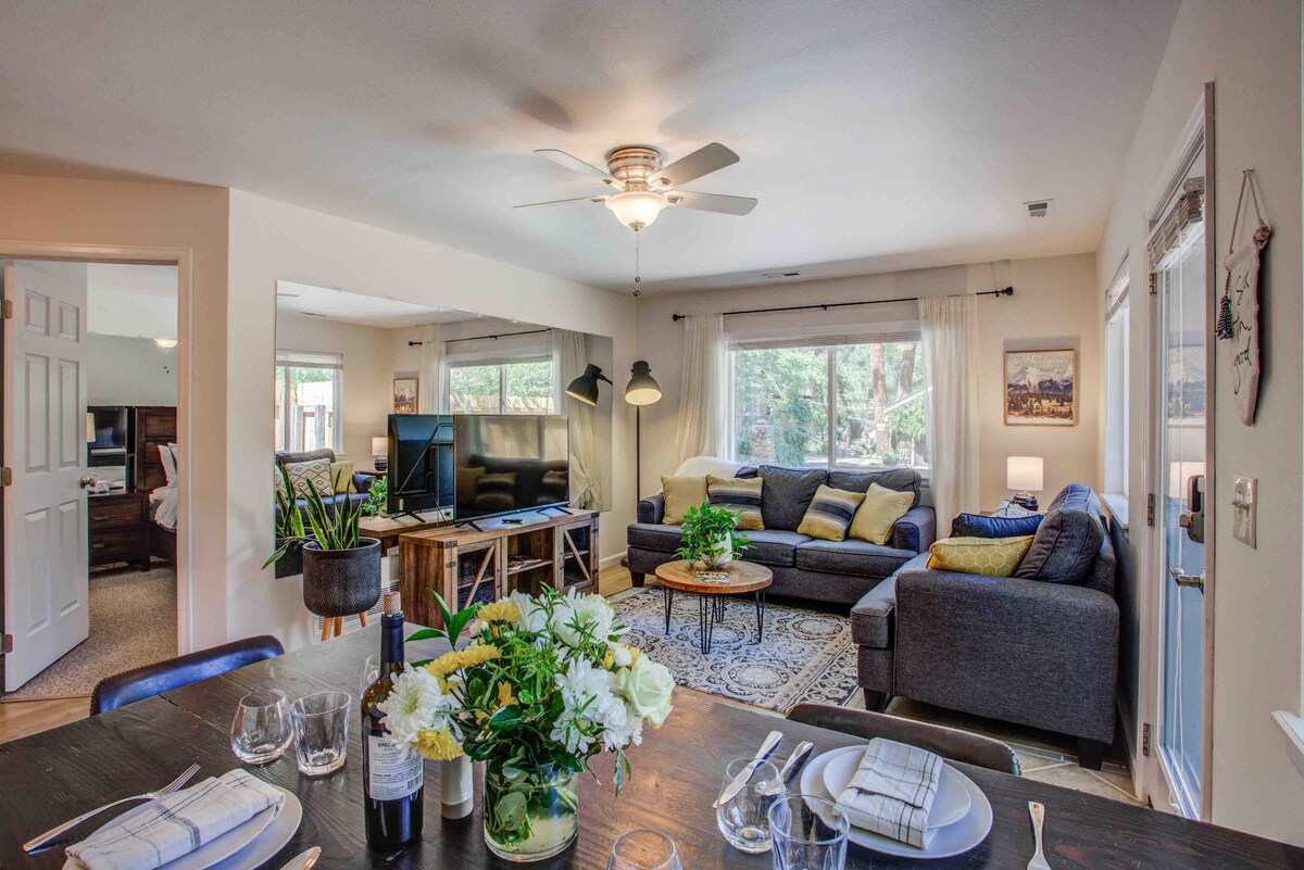With a river in the backyard next to the private hot tub and sauna, what more could you need? If you love watching local wildlife, listening the sound of the creek, and relaxing on a luxurious back patio that’s perfect for all seasons, then RiverHouse South by Forest & Peak Retreats is for you! Enjoy the full amenities of a kitchen stocked with a curator’s touch, heated towel rack, remote control gas fireplace, top-to-bottom remodel. Book RiverHouse South, by Forest & Peak Retreats, today!