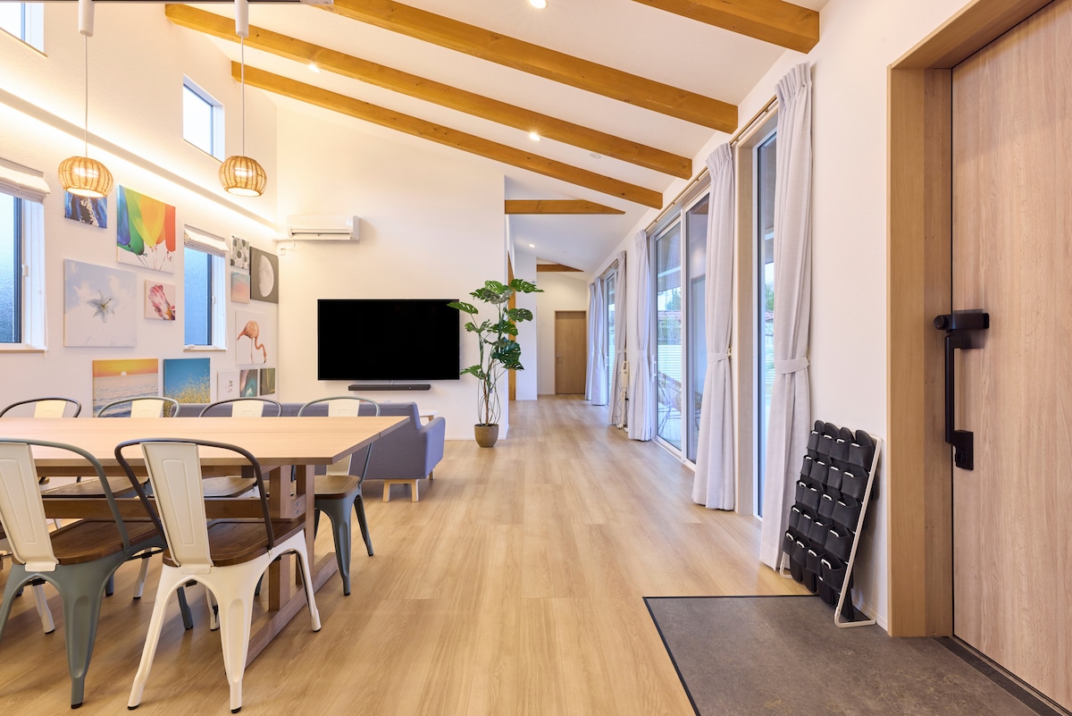 「nicotto九十九里」 海近くの120㎡の新築リゾート別荘です。 最大定員12名&ペット可、ユニバーサルデザインのため、複数ご家族、お友達グループ、大切なペットと、同じ時間・同じ空間を一緒に楽しめます。 東京から車で90分、ビーチまで徒歩7分、コンビニ徒歩6分という好立地です。 建物は、平屋2LDKで、段差/高さ/通路幅を配慮した設計のため、安心してご利用いただけます。みんなが集まりやすい天井高の広々リビング・ダイニングと、屋内外がつながるガーデンビューの開放感が魅力。大画面TVでNetflix見放題、カードゲームもあります。細部までこだわった上質で非日常感のある空間です。 屋外では、ヤシの木や広い庭を眺めながら、屋根付きBBQスペースや焚き火をお楽しみいただけます。室内と繋がるウッドデッキでは、外気を感じながら寛げる最高のスペースで、夜は星空観察もできます。さらに、庭全体が柵で囲われているため貸切ドッグランとなっています。 ※ペット同伴やBBQご利用の際は、必ずリスティング写真掲載の案内をご覧ください ※設備詳細や注意点も、リスティング写真掲載の案内をご確認ください