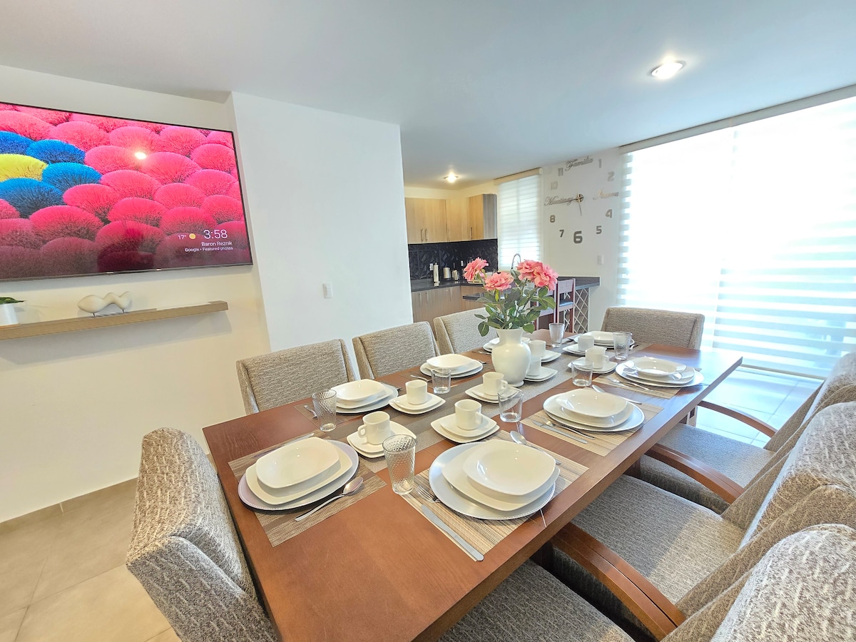 Modern open space apartment, queen size bed and double sofa bed. With a large equipped kitchen and a spectacular terrace with a barbecue. The apartment is in a high-security area. Public golf course, exercise areas, beautiful gardens and shopping plazas. A comfortable, quiet and harmonious space where you can enjoy pleasant family moments. Only a 5-minute drive from Anahuac University, ideal for students, executives or vacationers.