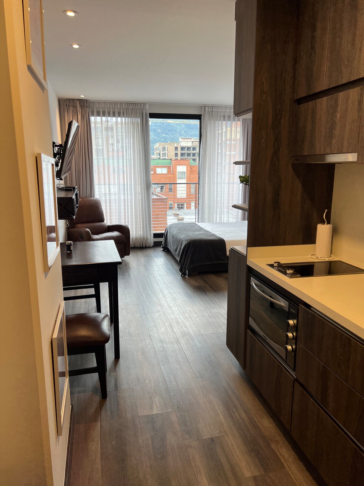 Enjoy & relax in this calm, stylish, illuminated unit 1 bedroom apto, with 4 set dinner table, sofa bed for additional person, 3.5 meters ceiling to floor, Located in the best area of Bogota DC, great for buz or family & friends trips who want to stay in a loft, it will your home, it has morning sun, everything is walking distance great selection of restaurants, coffee shops, coworking spaces, corporate offices , markets, and much more, close by a great Park del Museo del Chico., Park de la 93