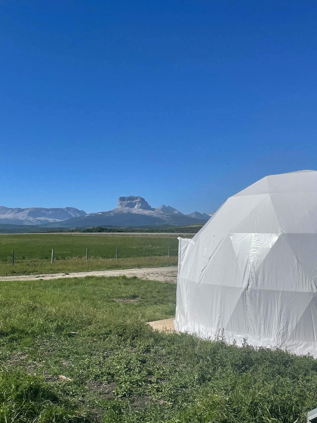 Wake up to the breathtaking panoramic view of the Rockies from our unique Grizzly Nook Dome and enjoy a cozy and intimate retreat! Our dome features 1 queen bed, dining and sitting areas, a fire pit (+ lighter) and an outside area. We also provide a water jug, cups and kettle. Guest will have access to a shared bathroom in a different building with toilets and sinks with running water. No showers at this time. The dome is not heated, but we do provide a fan if needed.