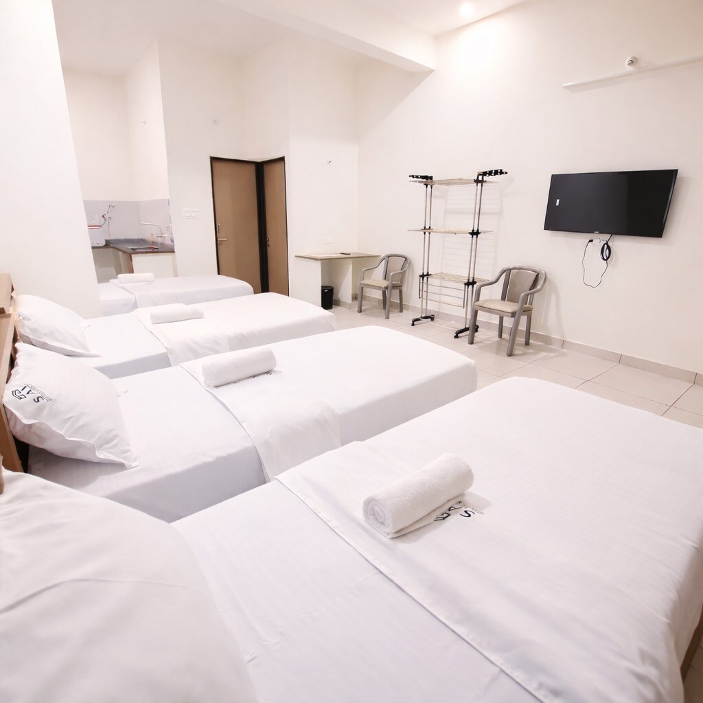 Spacious 3-Bedroom Residence Layout: Foyer, separate living & dining halls, balcony, kitchen with utility. Sleeping: 3 bedrooms, additional cot in common area, and an extendable sofa. Convenience: 3 bathrooms and a dedicated work desk. Essentials: 24/7 hot water, power backup, night security, and daily housekeeping.