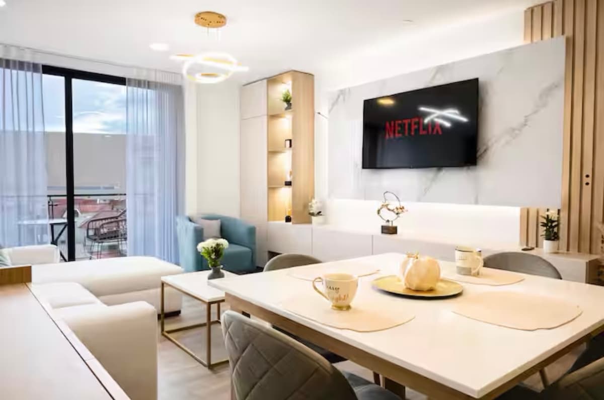 This stylish place to stay is perfect for couples, short family stays, or long work stays. We have a Jacuzzi inside the apartment, a bioethanol fireplace, and a living room with an 85” screen for the best nights and unforgettable experiences of your vacation. King size bed and beautiful balconies. Fully-equipped kitchen with all the necessary implements. Close to laundries, shops, restaurants. Own parking and cameras overlooking the street for your peace of mind.
