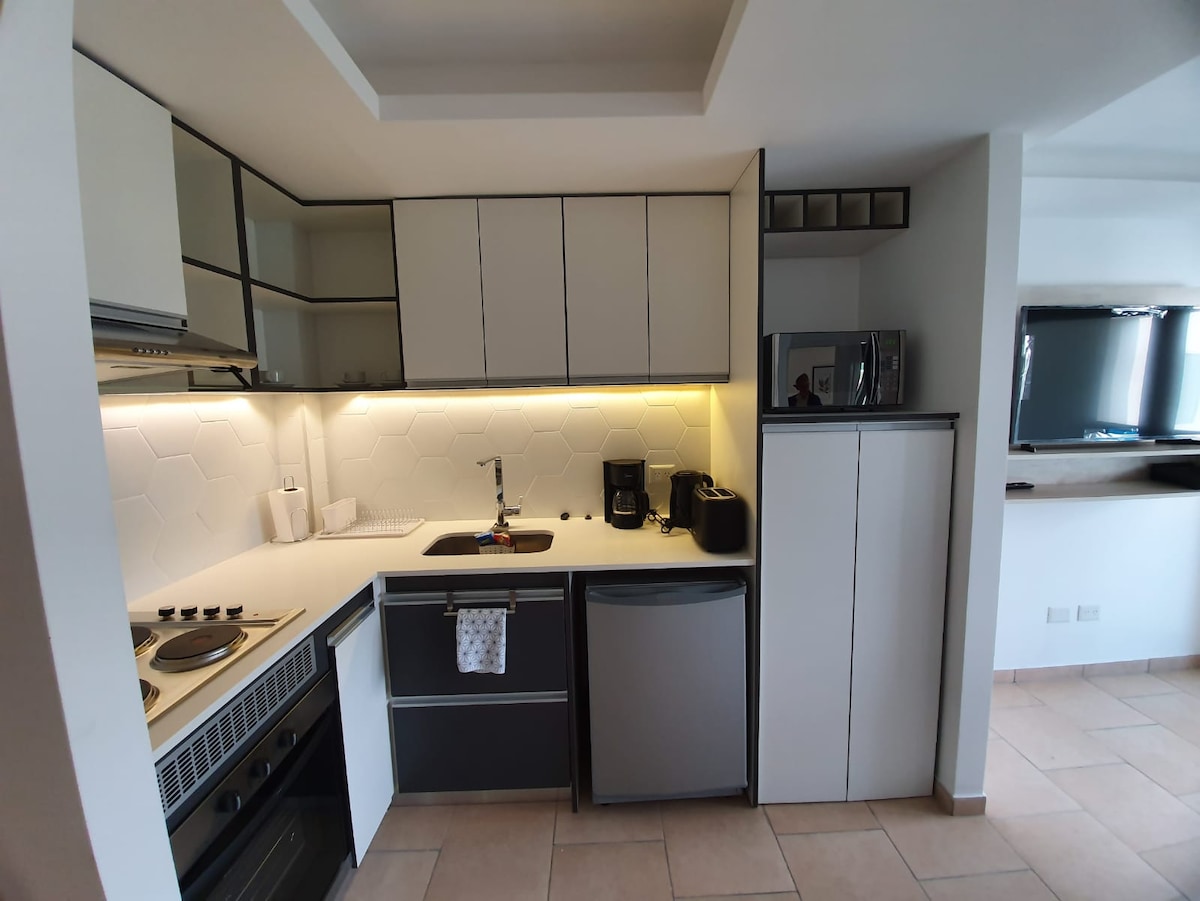 An apartment with a panoramic view of the city. It has a spacious environment where the bedroom, living room and kitchen are located, located in the Infinity Sky Building. Inside, it has quality furniture that will make your stay very pleasant and comfortable. It has a kitchen equipped with an oven and microwave, a kitchen set and full tableware, Wi-Fi and cable TV. Its location is excellent due to its proximity to the center, being 200 meters from the main street.