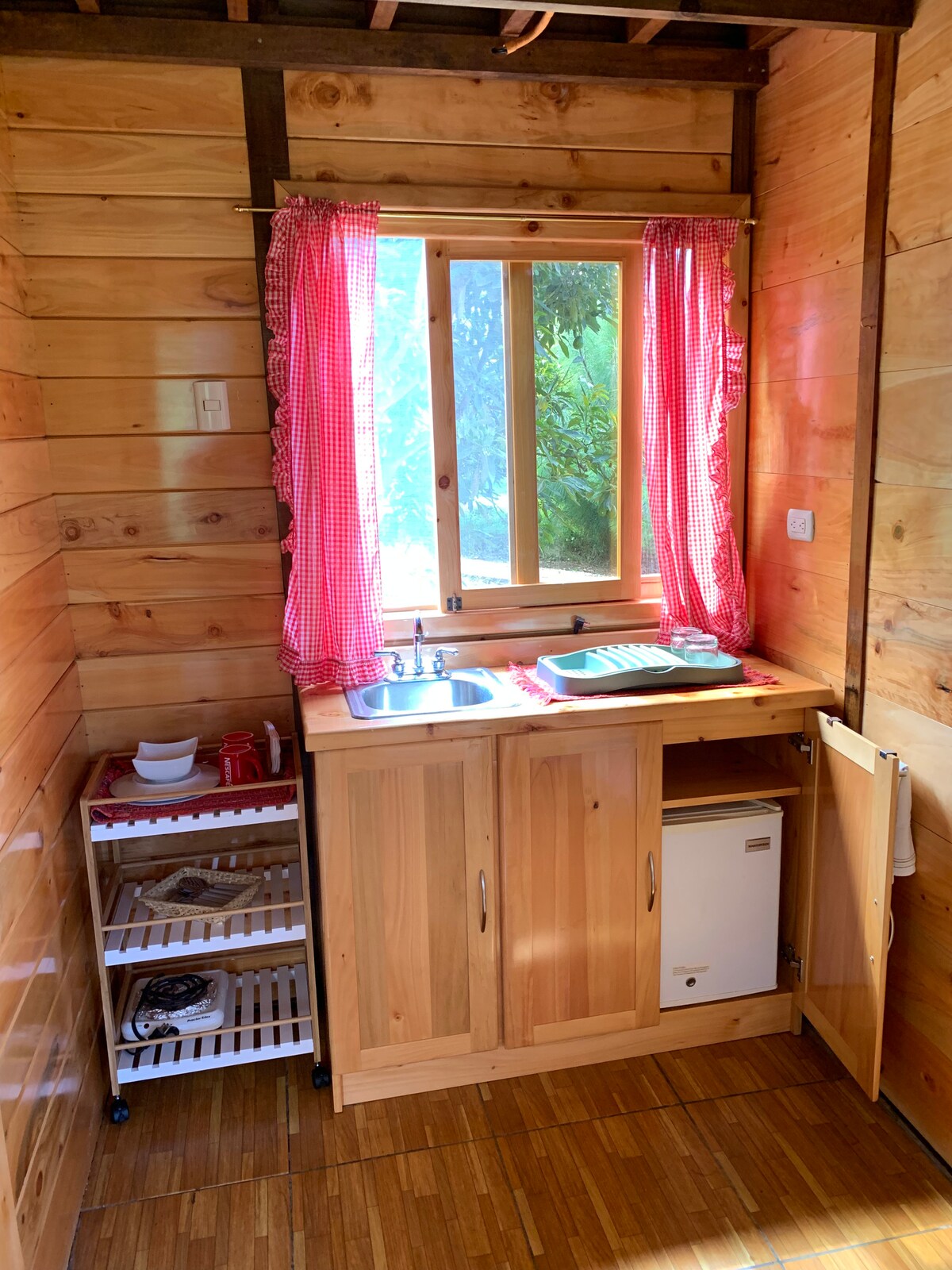 This cozy cabin in the woods offers a queen bed, a kitchen equipped with utensils, a private bathroom, and a comfortable living room with a TV. Large windows provide a beautiful view of the forest, creating a relaxing and natural atmosphere, ideal for disconnecting and enjoying the tranquility of the surroundings.