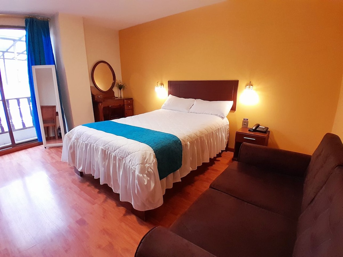 Enjoy a pleasant and comfortable stay with breakfast in your charming hotel room, where you can rest and share unforgettable moments. In addition to your room, you can enjoy a beautiful view on the hotel terrace, where you can be dazzled by the panoramic view of the volcanoes that surround the city of Riobamba, including the snowy Chimborazo. In addition to your room, you can also enjoy the multiple common areas such as cafeteria, kitchen, living room and terrace.
