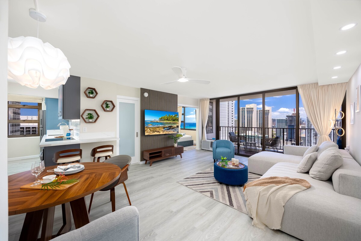 Your dream Vacation to Waikiki, Hawaii is about to begin! Wake up to amazing ocean view from our 26th floor, completely remodeled beautiful studio. Everything is brand new in this cozy comfortable sweet home. Then, after a day of adventuring in the world-famous island O'ahu, come back to a comfortable brand new queen bed, modern kitchen with a big refrigerator and induction cook top, a coffee & tea station to relax and unwind. This is your vacation to enjoy, and we can't wait to host you.