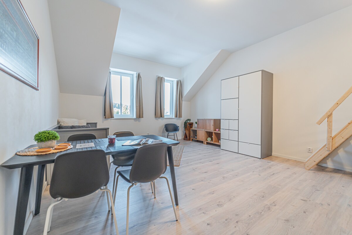 A cosy, stylishly furnished 2+kk apartment is located in the picturesque surroundings of the Ore Mountains, in the village of Černý potok, just 10 km from Klínovec. The apartment offers: Living room with sofa bed and kitchenette. Bedroom with double bed. Full bathroom. On the ground floor of the building you can use the sauna with relaxation room. (online booking). Sauna is for a fee. The apartment is located in a quiet location near the forest, 15 km from Klínovec. The apartment has a terrace with a small seating area.