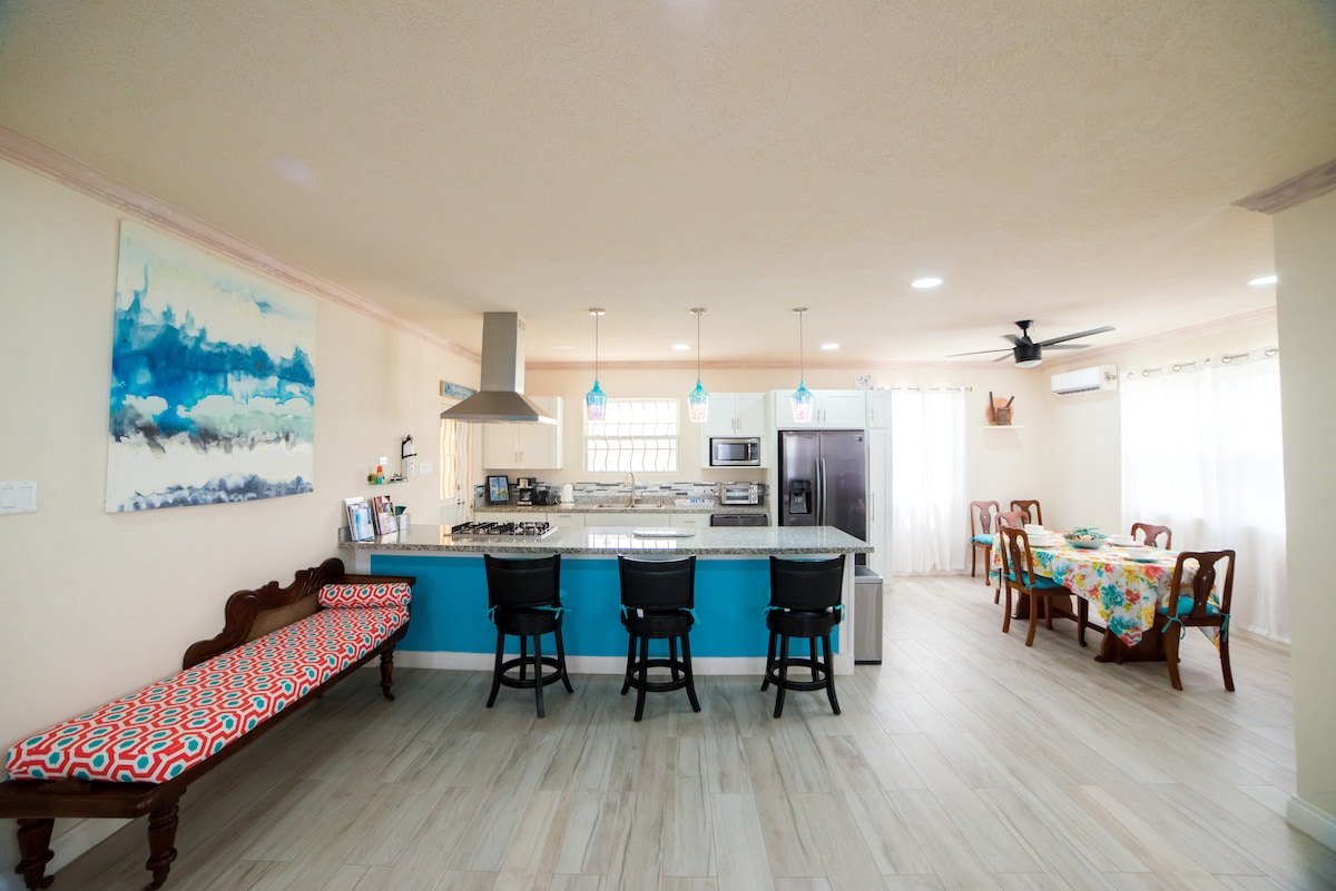 Spacious and fully air conditioned 2 bedroom/2 bathroom house conveniently located in Dover a stone throw away from the Sandals resort and the popular Dover Beach. There is an attached studio apt which can be rented either separately or together with the house. All the accommodations are new, and the décor is modern and tropical. There is parking available and there is a large patio and shady back garden. You are just a stroll from several bars, restaurants, groceries and bus route.