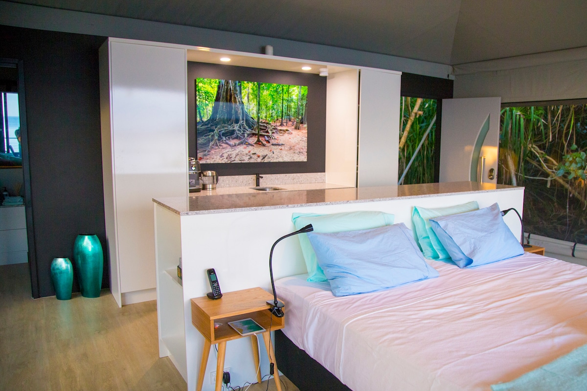 A luxury, glass-fronted eco-chalet, right on the coast. Gaze out over kilometres of uninhabited coastline from your bed as seabirds soar past at arm’s length and parrotfish cruise the reef below. The only accommodation inside the Christmas Island National Park, your stay helps fund important conservation in one of the most extraordinary environments on Earth. Assembled by hand, this visionary eco-chalet conjures the ultimate paradox of elegant luxury, completely immersed in wilderness.