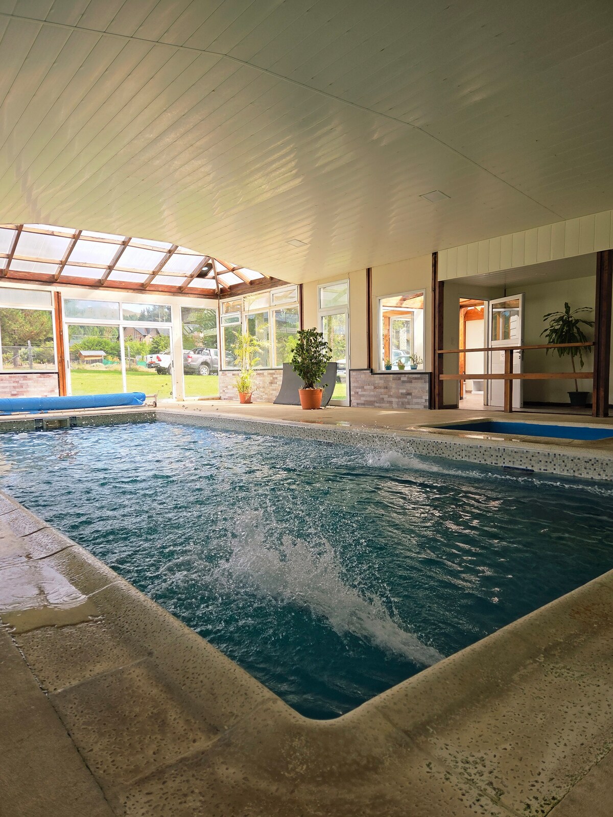 Relax with the whole family in this exclusive, quiet, and modern chalet, to enjoy the rest of your excursions in the complete facilities; with a barbecue next to the pool with its unique waterfall, looking at the stars of the immeasurable Patagonian sky and accompanied only by the sporadic noise of crickets. Stop in the morning for breakfast in the gallery, accompanied only by the sound of cardinals and unique birds of the area.