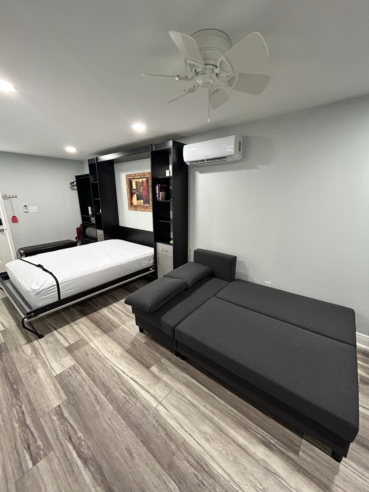 No shared areas. This apartment is located in a separate area of the house with a private entrance. It has 1 bedroom with a queen size bed, 55” smart tv, dresser, closet, and 2 nightstands. The den contains a 50” smart tv, sink, microwave, table and 2 chairs, cooktop, small refrigerator/freezer, “L” shaped sofa. The bathroom has double vanity sink, shower, tub, linen closet and body soap dispenser. Wifi, Netflix, Amazon Prime, HBO Max included. Queen air mattress available. Private back patio