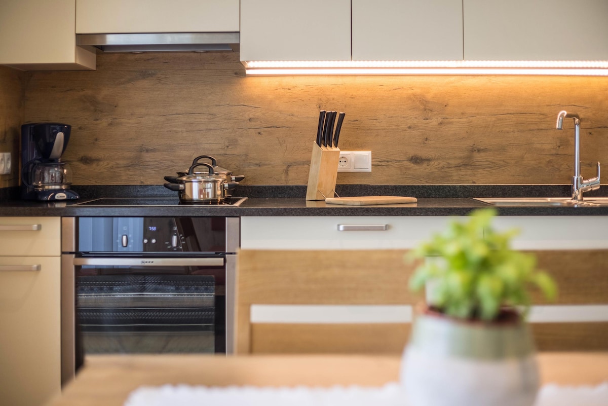 The apartment Thalerhof Naturae Lignum is situated in Unterinn Ritten, which is 15 minutes by car (11 km) away from Bolzano/Bozen in South Tirol, Italy. It boasts a spectacular view of the surrounding Alps, along with newly renovated interior design, thus making it a wonderful getaway. The 45 m² apartment consists of a living room, a well-equipped kitchen with a dishwasher, 2 bedrooms as well as one bathroom and can therefore accommodate 4 people.