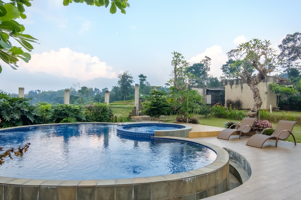 Relax, unwind, or even working. This tiny villa is a place for all. Nestled in the feet of Mount Salak overviewing Mount Pangrango and our own garden. Your solution for short getaway from city's hustle, 70 minutes away from Jakarta. *Fasilitas:* 1. Swimming Pool (Ubud's-like View) 2. Balcony (Gunung Pangrango + Sunrise View) 3. Board games (catur, uno, stacko, etc) 4. TV Netflix Youtube 5. Wifi up to 5Mbps 6. Gardens 7. Kitchen 8. Viewing Deck