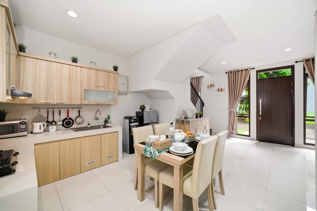 This property has 3 bedrooms and 1 mezzanine room that can be used as a bedroom with a king-size bed, a queen-size bed, a super single bed, 2 extra single beds in the mezzanine room, and a sofa bed for 2 people in the living room. This residence can accommodate up to 8 people. Up to 6 people included, additional charges of IDR 75,000/person/night for the 7th and 8th guests. For commercial purposes, there is an additional fee of IDR 500,000 per booking. It's strategically located, on the main road. 150 Mbps Wi-Fi