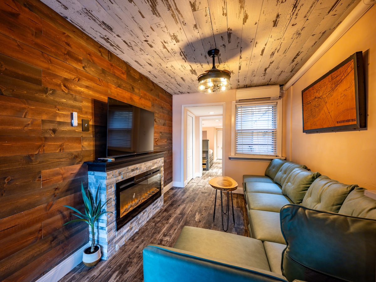 River views and easy access to everything from this perfectly located home base. The spacious unit offers guests a cozy yet expansive space in the heart of the city. The living area features ample seating facing a TV, ideal for relaxation. The kitchen is fully equipped for meal prep, and the bedroom offers a comfortable king size bed and 65" TV. One dedicated parking space is available for added convenience. Experience historic charm with modern amenities for a memorable stay in Harrisburg.