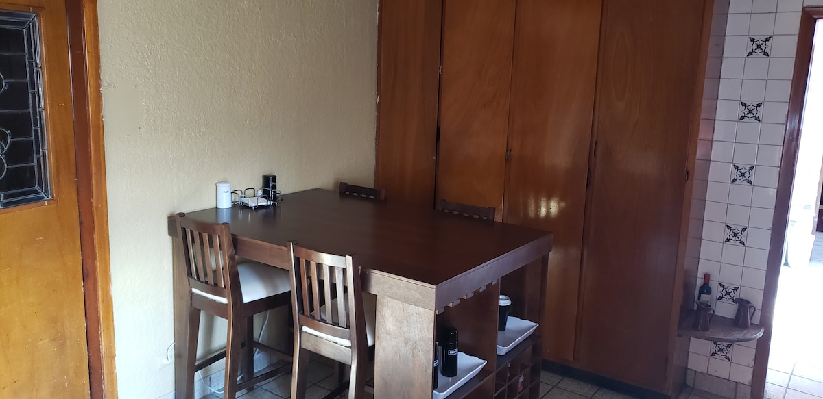 Departamento en zona muy centrica y segura de la ciudad. Cuenta con espacio para dos carros con cocheras seguras. Un balcon para lectura, beber algo y/o fumar si asi lo deceas. Tiene una cocina completa con refrigerador, microondas, estufa, sartenes y platos también un desayunador para 4 personas. El baño cuenta con tina grande (caben dos personas) y doble regadera. Un closet muy amplio en donde te sobrara el espacio. WIFI incluido.