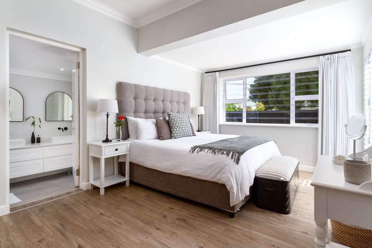 Enjoy a home away from home in the leafy Southern suburb of Claremont. This eclectic Afro-Japandi inspired home is the perfect base for Exploring Cape Town’s beaches, wineries, and city centre. The kitchen is the heart of this home extending into the generous living area out to the covered outdoor patio and Braai. Green garden to enjoy the summer breeze and dine al fresco. Natural wooden floors on ground level with touches of green. Solar Power. 4 bedrooms, 3 en-suite. Baby gates, cot on request