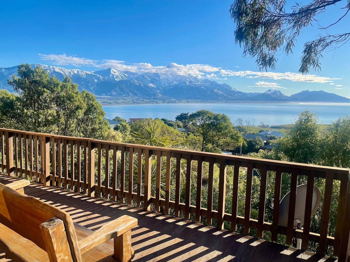 A lovely place to stay in Kaikōura with mountain views, all day sun and a private deck. Not even a 5 minute drive to town center. It is the 3rd house down a private lane, parking right by the house. Large open plan living area and good sized bedrooms. West boundary is a peaceful creek (be aware of this if you have children). A great heat pump and additional big log burner will keep you warm during the winter months with a heat distribution system to keep you warm in the bedrooms. No WiFi sorry!