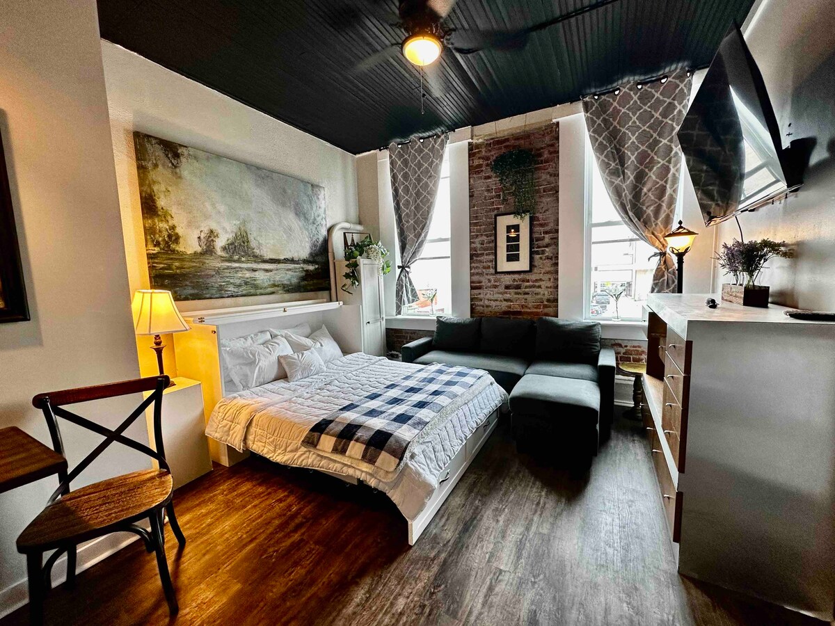 The allée des fraises loft is a studio loft inspired by my stay in Paris and London, located on the second floor of an historic 1890’s building. The charming brick walls and rustic aesthetics add character to this bright space. Perfect for a couple’s getaway or a solo traveler in town for work. Walking distance to coffee shops, restaurants, local cafes, boutiques, breweries and more. Near Austin Peay State University, Fort Campbell and less than hour from Nashville. A parking pass is provided.