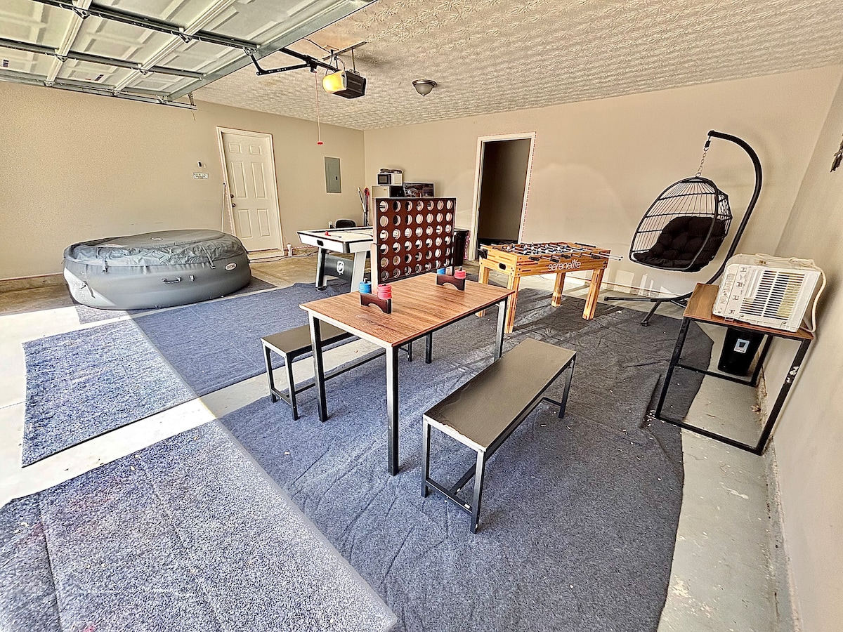 This unique home features ✅ 2 Kingsize Luxury Bedrooms ✅ 2 Queen Size Bedrooms ✅ 1 Double Bedroom Suite ✅Master has Private Bathroom W Garden Tub ✅Walk in Closets ✅ Make Up Vanities ✅32”-50” TV in the bedrooms ✅Electronic Door Lock on each bedroom While the common areas feature: ✅ Living Rooms (upstairs ) ✅ Back patio with swings ✅ Game room (garage area) ✅ Indoor Hot Tub (garage area) ✅ Air Hockey Table ✅ 24 Hr Hot Tub ✅ In home gym ✅ Designated smoking areas