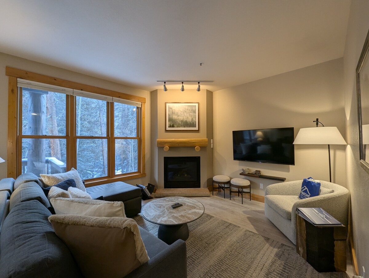 This 1 bedroom 1 bathroom cozy cottage-like condo is perfect for your stay in Keystone. Step into the comfortable living space with high ceilings and great decor. The living room features a gas fireplace, flat screen TV, queen size sleeper sofa, and glass doors opening to the private balcony containing a propane grill. Enjoy cooking delicious meals in the fully equipped kitchen and sit down at the table seating 4 people. The primary bedroom features a queen size bed and flat screen TV.