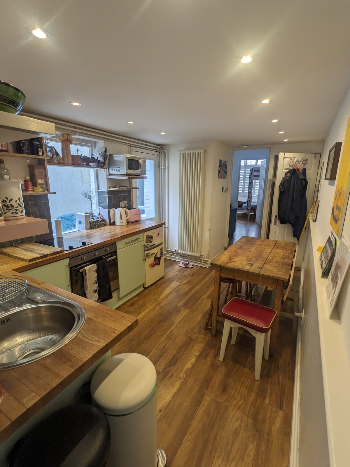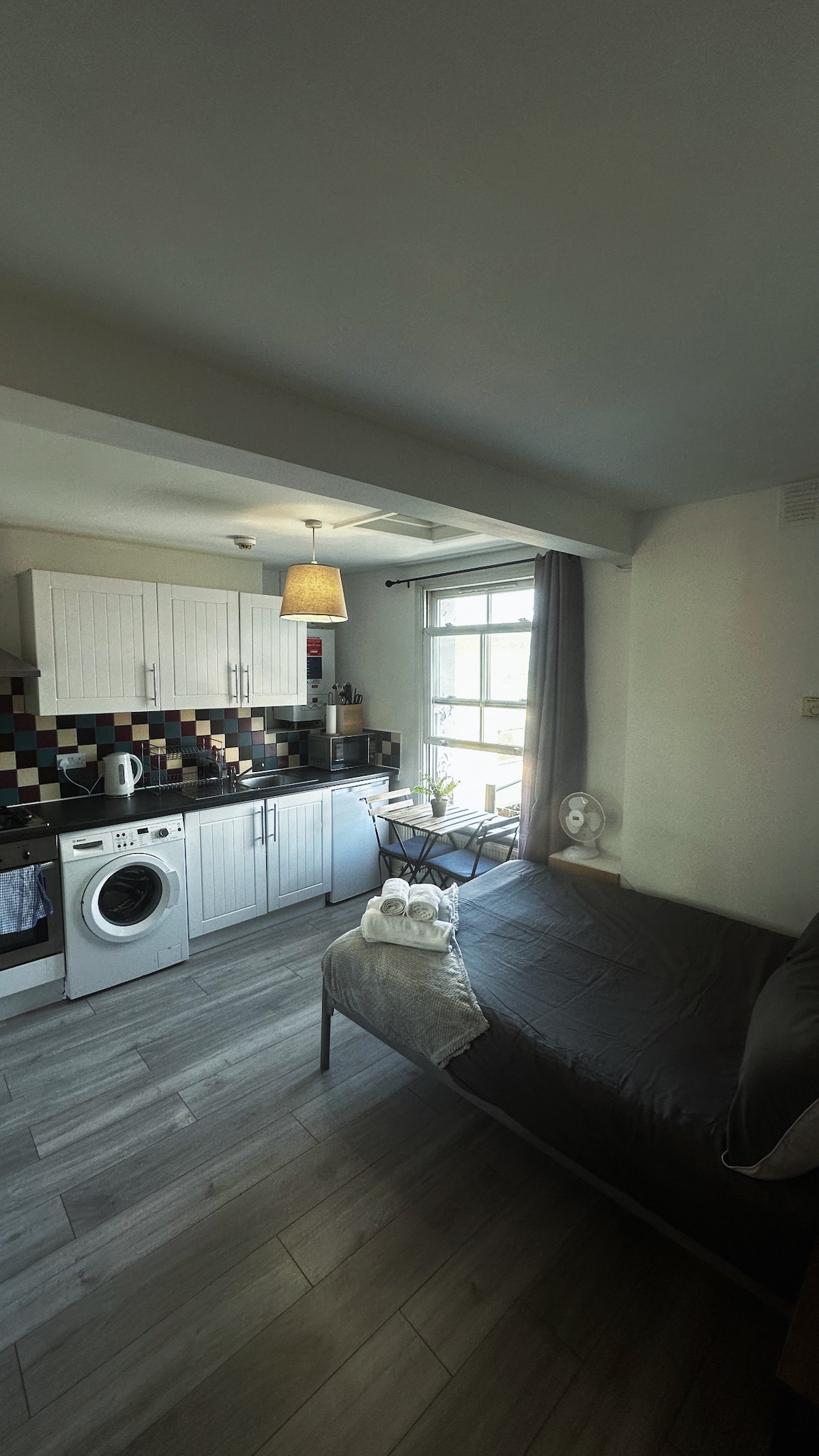 Relax in this spacious, quiet, garden flat within our Victorian house.Separate private entrance with fully-equipped kitchen/diner leading onto pretty garden patio. The huge bedroom is the perfect place for a quiet night's sleep and has a comfortable king-size bed. The bathroom has a shower over bath, basin and washer/dryer. Separate wc. Sunny living room has chairs, a recliner, TV, coffee tables, small sofa bed. On request, longer adult size single bed can be added to create second bedroom.