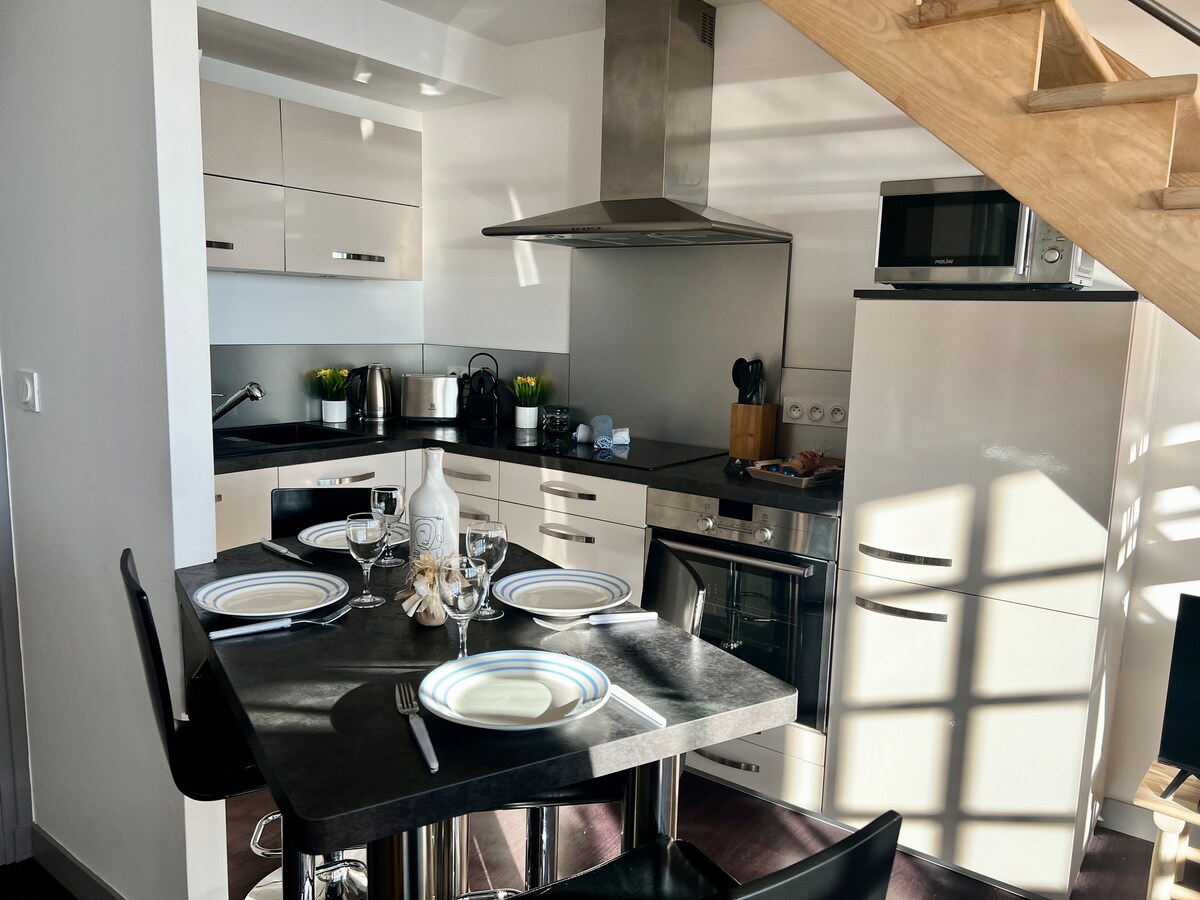 Come and discover our charming apartment decorated in a cocooning spirit ideally located on the ground floor at the foot of the Grands Sables beach. Direct access to local shops, the tourist office and the nautical base. It is equipped for 2/3 people: - a bedroom with a 160 cm bed - a living room with sofa bed, TV, Wi-Fi - a fully equipped kitchen with dishwasher - a bathroom with shower - separate toilets - a 10 m2 terrace with sea view and garden furniture