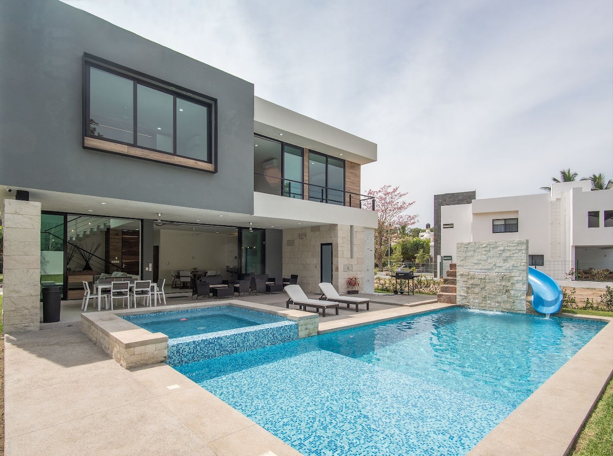 Amazing Home with spectacular views located on the Las Hadas Peninsula is the perfect spot for your family or group vacation. Large 2 story outdoor patio with heated plunge pool and built in grill . Ocean views thru out the home . 10 minute walk to Beach(Playa la Audiencia). Easy access to shopping Walmart, Sams Club, Starbucks and other Restaurants. 24 hour gated security. Public transportation(bus) runs in front of condo entrance. Pet friendly, we accept small dogs and cats.