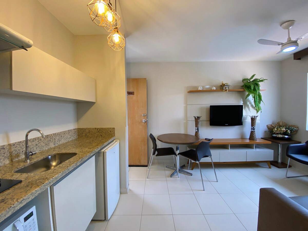 The apartment is in the Parque das Águas Quentes Condominium. It features a water park with 3 swimming pools, restaurant, snack bar, sauna, fitness center, wet bar, waterfalls, game room and garage (one space). The apartment is fully furnished (TV, sofa, tables, chairs), two en-suites, one with air-conditioning, full kitchen, with microwave, refrigerator, freezer, filter, stove. The apartment accommodates up to 5 people (condominium rules).