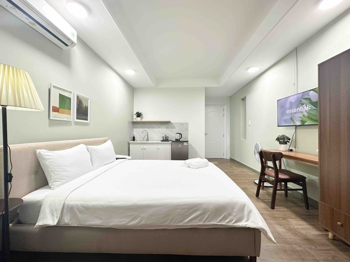 Our studio is perfect for your next stay in Saigon! The tropical interior is inspired by the famous architecture of Hoi An. Located in central Saigon, it's a short 10 minutes walk from the backpacker area. Enjoy heavenly views of downtown Saigon, especially at night. Includes full kitchen and bathroom w/ rain shower & standing bathtub! Amenities include: o hotel-quality king bed o TV w Netflix o Marshall bluetooth speaker o fully-stocked coffee bar o front-loading washer o toilet w/ bidet