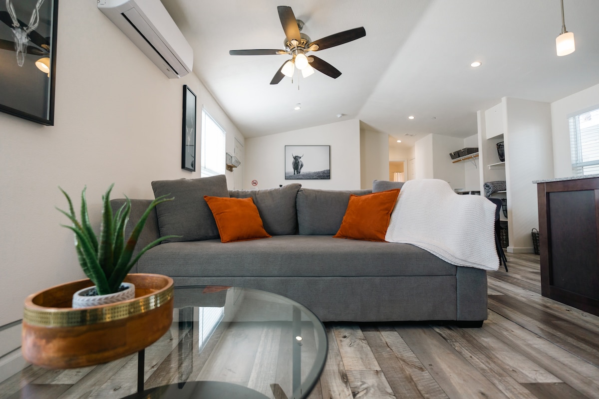 This tiny house is a delightfully designed 400 sq. ft. plus large deck. Light-filled and mid-century modern-appointed in a gorgeous hot springs retreat, situated near a lake and the mineral pools. There are wonderful views of the sunset over the mountains from the deck. If you are out walking in the morning you will catch the sunrise behind the lake as egrets emerge, ducks stir from sleep and the black swans settle into the day. Enjoy morning coffee on the deck before your first hot pool dip!