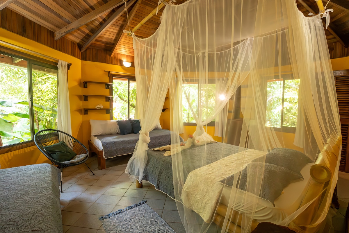 Come and enjoy a new experience in the jungle by staying in our new Treehouse build with a shipping container base. Gaze over at the treetops to the ocean, and enjoy watching the birds and monkeys from your porch. Stylish handmade furniture and designs. Open Air shower, open sky terrace.