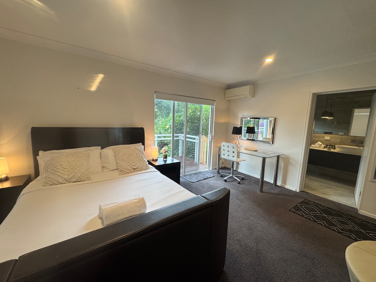 Luxury studio in a tropical garden,30 metres to beach front, designer bathroom with bath and rain shower, washing machine. A fully equipped kitchen, 1 queen size bed, fan, underfloor heating, outdoor deck with sea views and under cover private gazebo with lounge seating and electric barbecue /grill ,and all weather blinds. Your well behaved dog is welcome with its own bed and leashed between house and dog friendly beach at end of the garden..we are surrounded with wildlife that is protected .